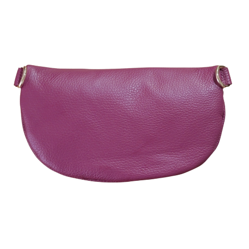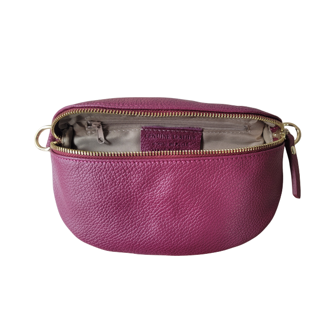 Crafted in a Burgundy toned leather. Designed for hands free ease, this bag keeps your essentials safe while keeping your style effortlessly refined. Featuring a top zip closure with gold-tone hardware, an adjustable strap for crossbody or waist wear, and a soft, supple texture that elevates any outfit. Perfect for travel, city days, and on the go chic.