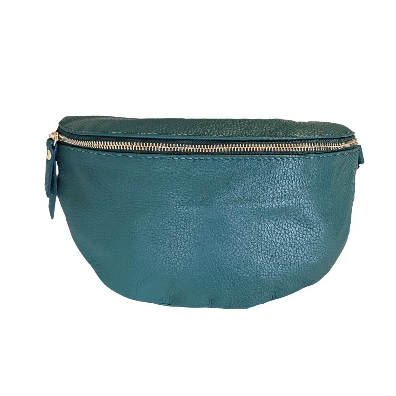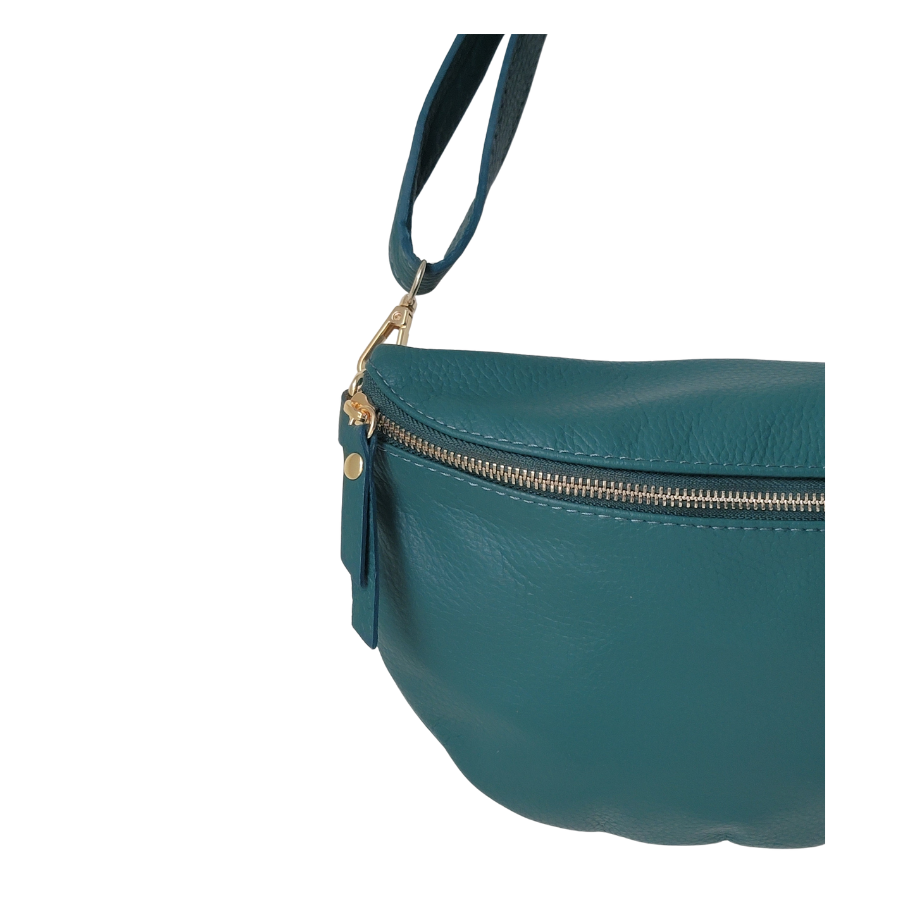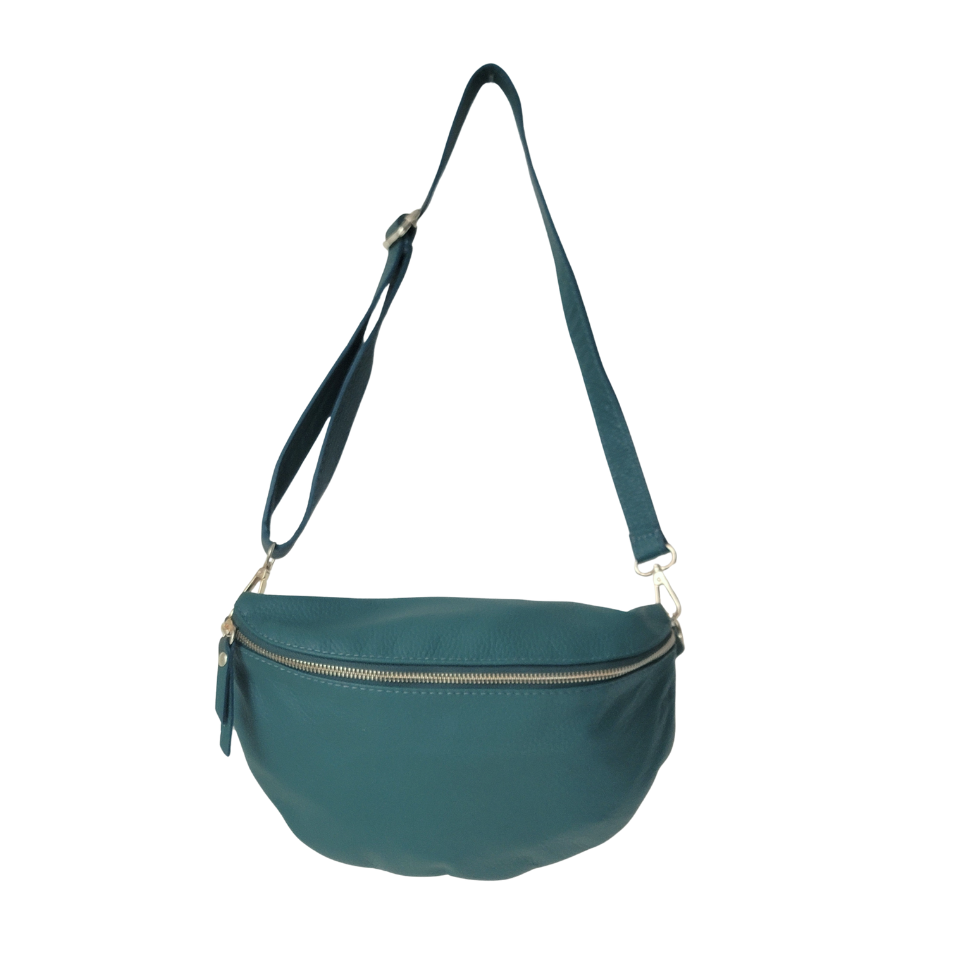 Clean lines and effortless style. This teal crossbody bag is crafted from soft, textured leather with a simple curved shape and silver hardware. The adjustable strap and zip closure keep it practical and refined, perfect for every day, worn over the shoulder or as a crossbody.