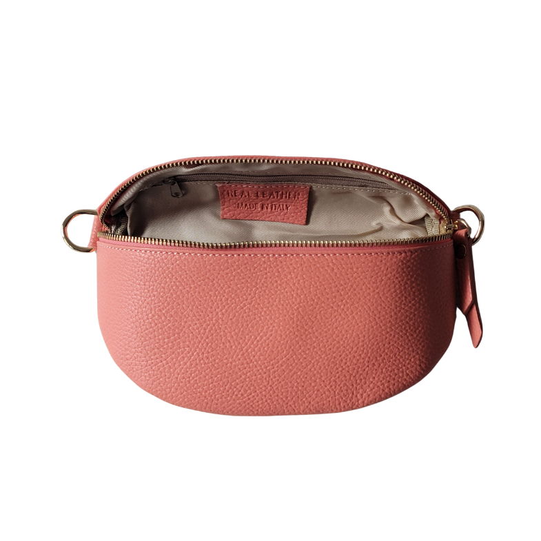 A simple, modern crossbody bag in a lovely shade of coral. Made from smooth, textured leather with a clean curved shape and subtle gold accents. Features a secure zip closure and an internal pocket to keep your essentials safe. The adjustable strap ensures a comfortable fit, whether worn over the shoulder or as a crossbody.